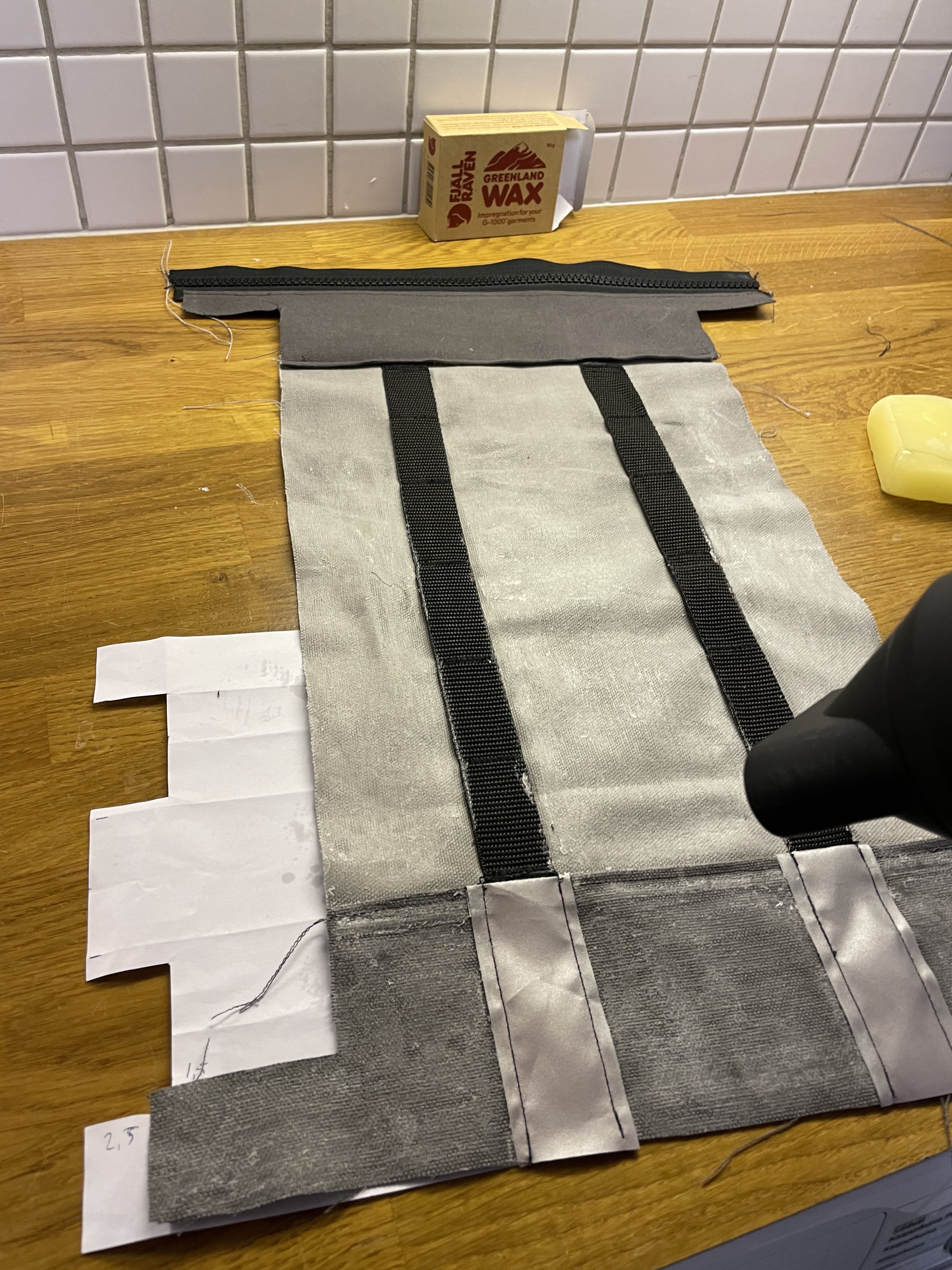 Aloitin kiinnittämällä harmaat ja tummanharmat kankaat toisiinsa ja jatkoin ompelemalla PU-nauhat, heijastimet ja vetoketjun puoliskot yhdeksi kokonaisuudeksi. Vetoketjun toisen puolen kiinnitin yhdessä vetoketjun suojaläpän kanssa ennen kuin siirryin ompelemaan laukun sivukankaita kiinni toisiinsa (ylä+alaosa).